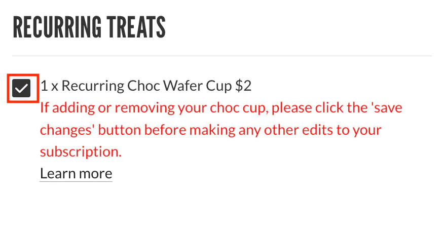 Once you've done that, you will receive a Choc Waffle Cup with every one of your monthly subscription orders. To remove it, simply follow the same steps above and uncheck the box.