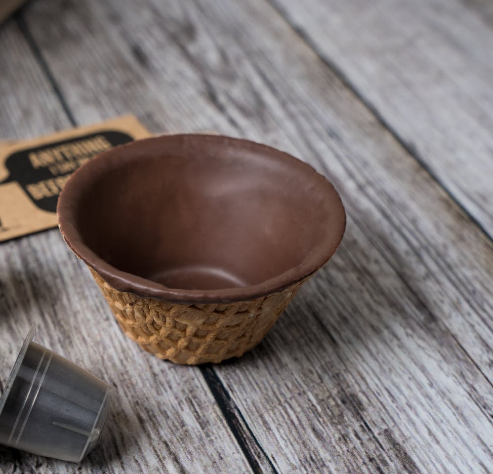 A waffle cup, coated with dark chocolate, filled with your favorite delicious coffee. How incredible does that sound?